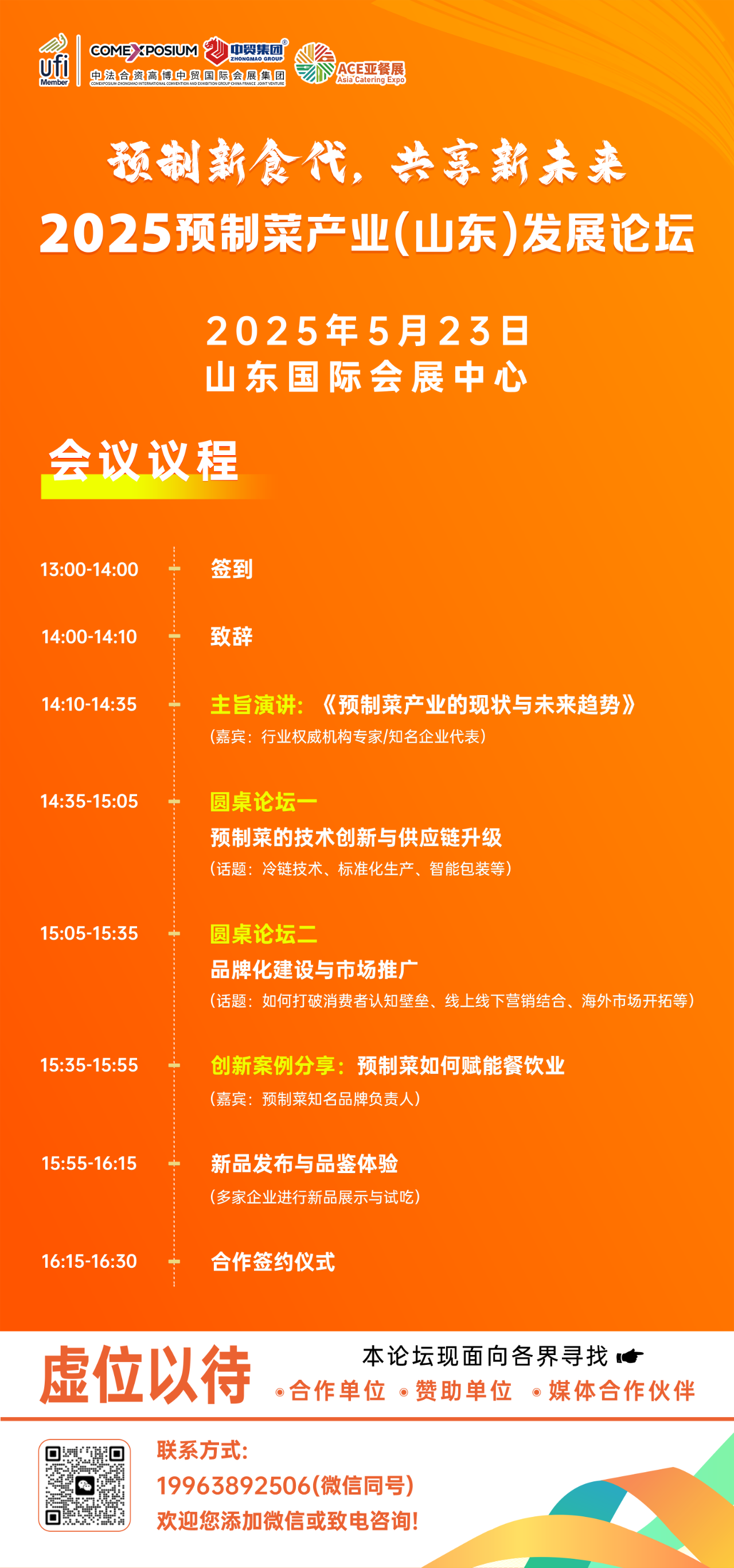 目前, 2025预制菜产业(山东)发展论坛组织筹备工作已经正式启动。现面向各界招募合作单位、赞助单位、媒体合作伙伴。如您有参与的想法,请致电19963892506(微信同号)。